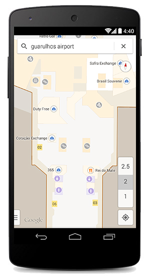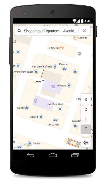 Com o Google Maps interno, os visitantes podem passar menos tempo procurando por diretórios de construção e mais tempo descobrindo novos pontos de interesse. Basta aplicar o zoom dentro e fora de um edifício e ir de andar em andar com os mapas internos.
